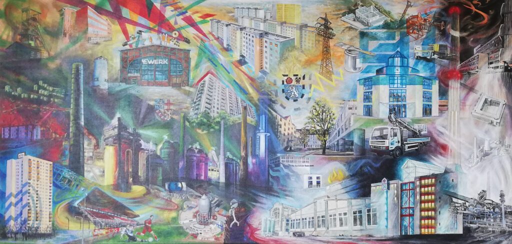 Dieses Gemälde zeigt das Firmengebäude der SL Szymanski sowie mehrere Bauobjekte, an den das Unternehmen in den vergangenen Jahren tätig war